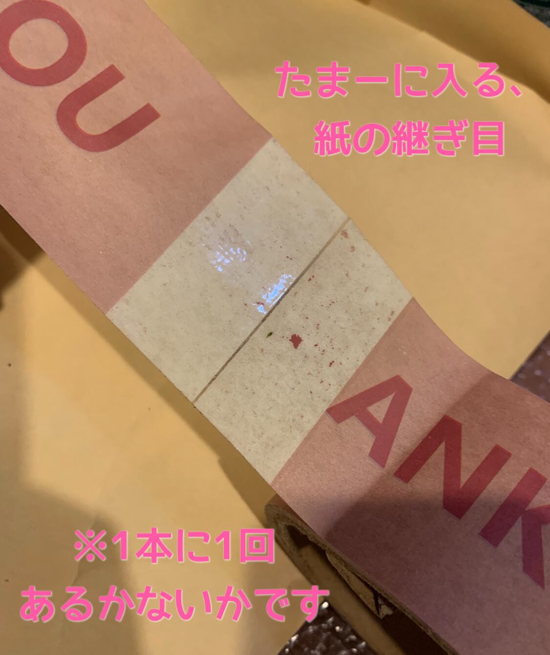 個別切断前の巨大ロールの、印刷終わりの紙交換部分だそうな。